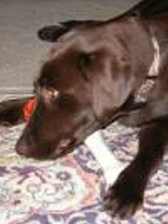 Pops has been given a complete checkup by our vet and given a clean bill of health. He is a bit overweight, and his foster family is working on that with lots of walking, up to 2 miles at a time, and diet. He is housebroken and leash-trained. On his walks he sticks right by the side of his foster unless he spots a rabbit. Then again he is a sporting dog and always seems ready to chase the critter down. Being an older dog he is a gentle soul and loves attention. He knows his basic commands like sit and lie down, but does have a slight problem with "stay" since he must interpret that as "stay with me". Another benefit to this older guy is that he does not chew on things he isn't supposed to. Being a Labrador Retriever he does have a strong sense of play and loves to fetch. His favorite toy right now is a ball, which he loves to retrieve. Pops has been neutered and the vet has informed us that he does not have any thyroid problems. In short, he is a great companion and would do well with a single person or family. He does well with young children over 5 years of age.